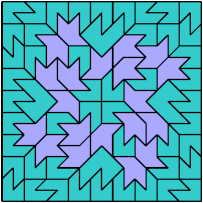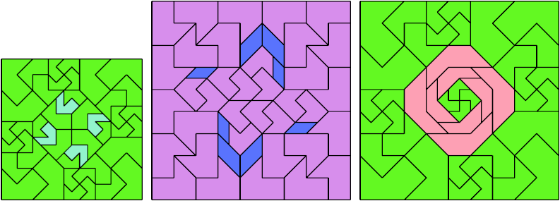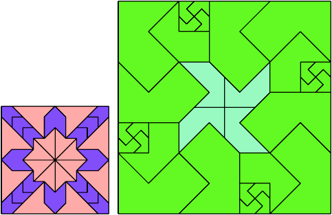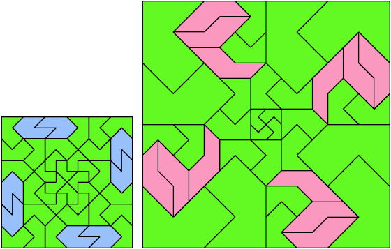 Here I show a rectangle tiled by a scaled tetrabolo and a scaled pentabolo, using at least one copy of each and as few total copies as is known to be possible. If you find a solution with fewer tiles or solve an unsolved case, please write.
