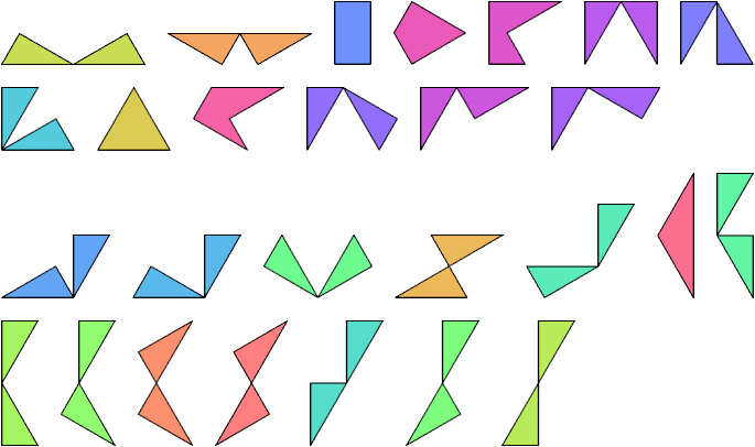 A polydrifter is a figure made by joining such triangles at edges or vertices. A didrifter is a polydrifter with 2 cells. Polydrifters are said to be two-sided if mirror images are considered to be the same, and one-sided if they are considered to be different. On the polyiamond grid there are 27 different two-sided didrifters, and 43 one-sided didrifters.