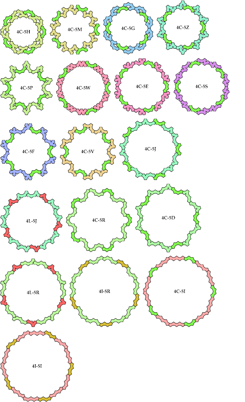 A Baiocchi figure is a figure formed by joining copies of a polyform and having the maximal symmetry for the polyform's class. For polypents, that means the symmetry of a regular decagon, or 10-way rotary with reflection.