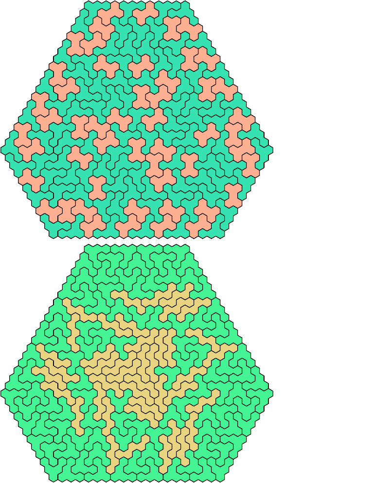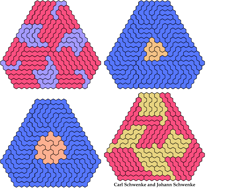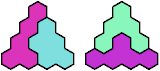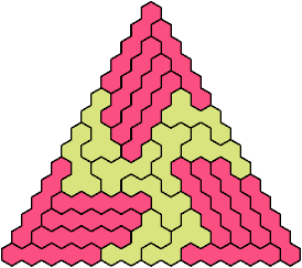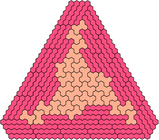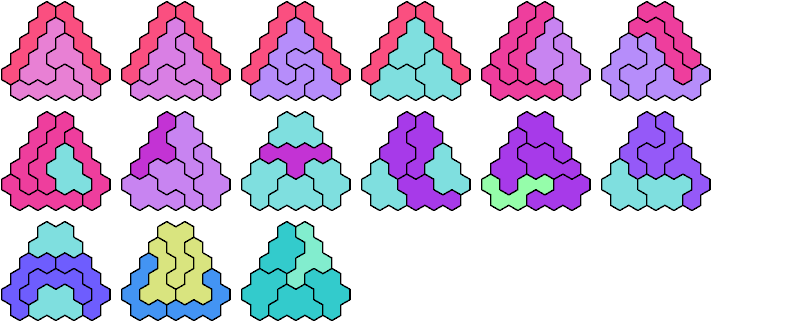 A triangular polyhex is an extreme form of a badge. Many of the solutions below are triangular. See the bottom of the page for non-triangular variants.