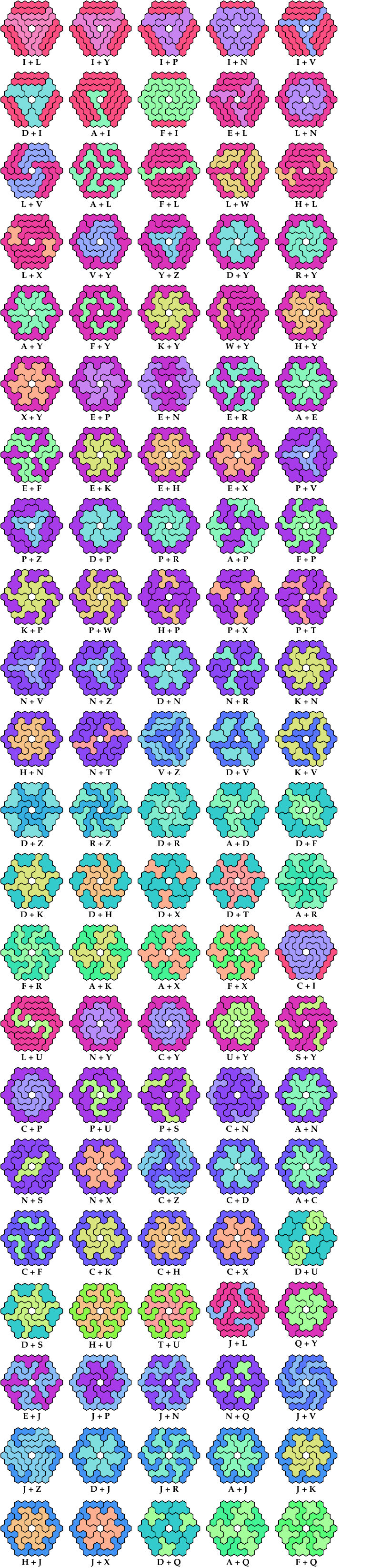 On this page, for each pair of pentahexes, I show a frame tiling with the fewest known cells, using at least one copy of each pentahex of the pair. If you find a smaller solution or solve an unsolved case, please write.