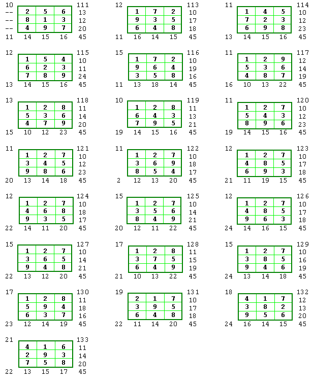 The following 22 order 3 heteroquares are from the list of 760 real order 3 heteroquares. Each has a different grand total, which is the sum of the 9 interior numbers and the 8 line sum numbers. These totals range between 111 and 133, with none totalling 112.