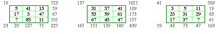 The following six heterosquares use the 9 consecutive primes from 31 to 67, so the total of these 9 cells is always 439 (a prime).