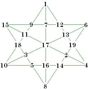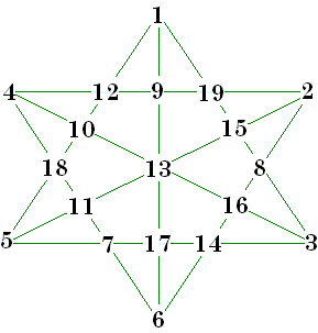 figure [2]. They found that the answer was affirmative. Their algorithm and the resulting computer search program found all possible solutions. There are actually 9 separate magic constants, ranging from 46 to 54. This search problem was made manageable by using several short-cuts.
