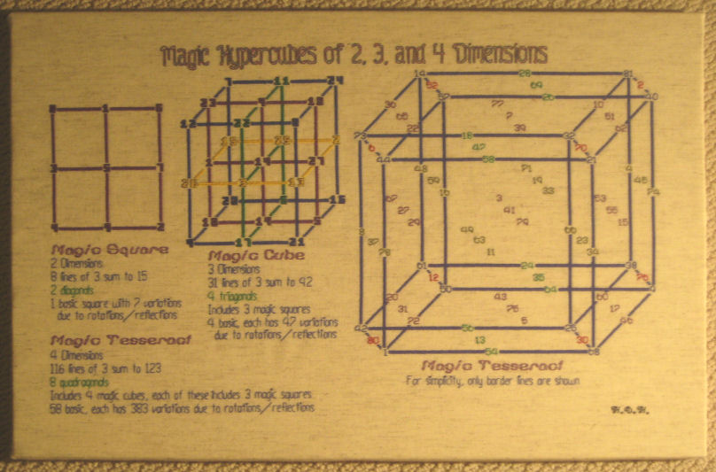 In cross-stitch. The Lho-shu order-3 square, order-3 cube # 3, and order-3 tesseract # 5 (Hendricks # 1) |