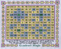 presented to him in a plastic desk stand. On the back of the pattern are diagrams showing how there are at least 428 different ways to form the number 40 using arrangements of 5 numbers. See How many groups = 65? for more information on this type of magic square. The cross-stitched magic square is 4.5 inches by 4.5 inches, and has 67 by 67 cross-stitches. (There are also red shadow back stitches on the digits which do not show in the picture.) |