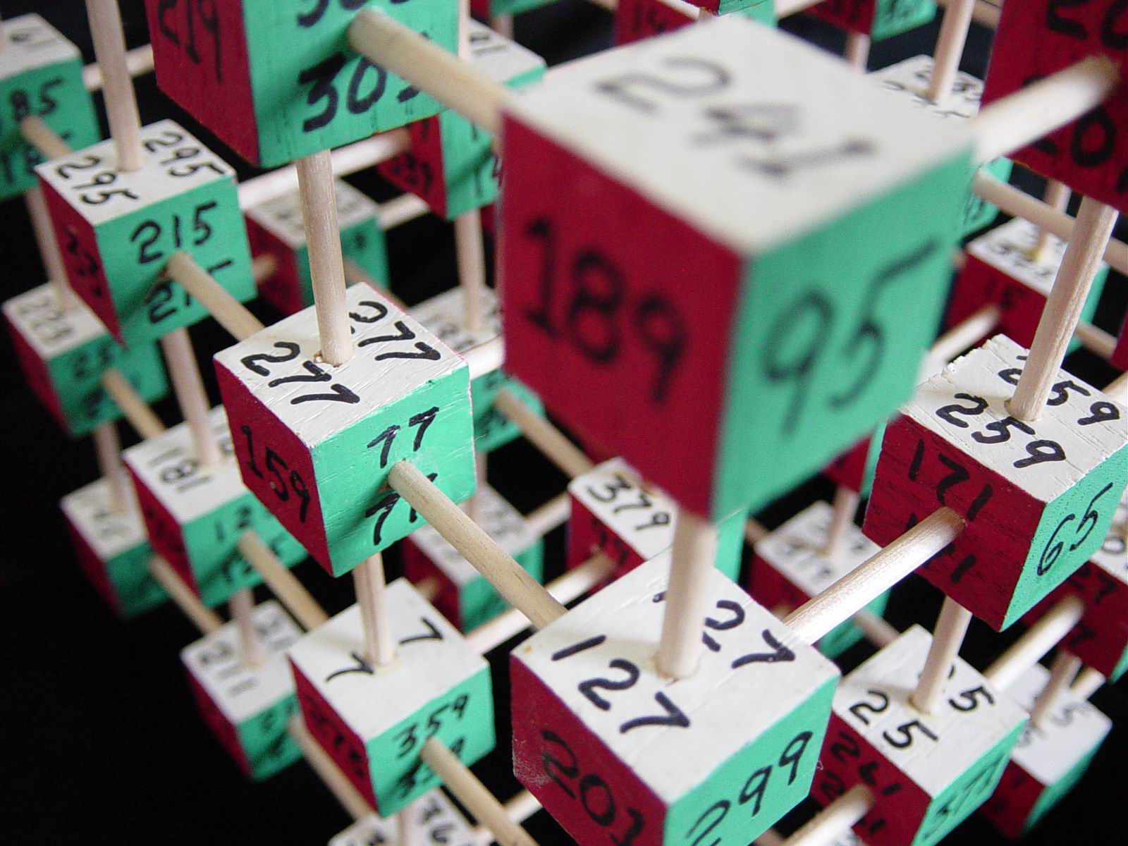 A wooden block and dowel construction of an order 4 pantriagonal magic cube. The numbers on each face of the cubelets represent a different magic cube. |