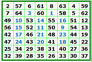Shows 1 of 36 simple magic squares that hold the maximum of 69 units of water.