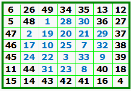 E. This is a number (not magic) square. (Disregard the fainter numbers. They are just inserted to complete the square.) The lake and the 2 ponds together retain 488 units of water. This is the maximum possible for an order-7 number square. [4]