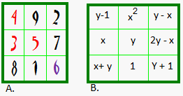 square (not counting rotations and reflections). B. is the algebraic representation of A. Compare x and y with the above table. C. is the order-5 Luo Shu format magic square. Compare colored integers with the above table. |
