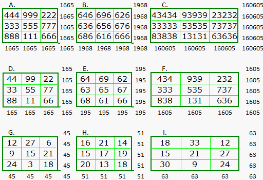 A. Original Luo Shu but with 3 digit redigits. B. 1 digit of A. with arbitrary first and last digits C. The 3 digits of A. with arbitrary 2nd and 4th digits inserted.