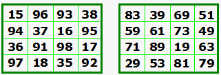 Together, the first 3 magic squares use the consecutive numbers from 1 to 97. The two order-4 squares each use the numbers 10, 11, 21, 22, 32, 33, 43, 44, 54, 55, 65, 66, 76, 77, 87, and 88. The order-9 composite square uses the remaining numbers. |