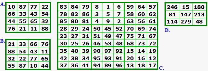 The concept of topographical numerical squares may be extended. Following are several examples. A. Franklin’s "forgotten" order-8 magic square contains 3 ‘lakes’and 2 'ponds'. [3] B. An order-9 simple magic square with 1 lake, 2 ‘ponds’ and 3 ‘islands’. 780 units are retained. [4] |