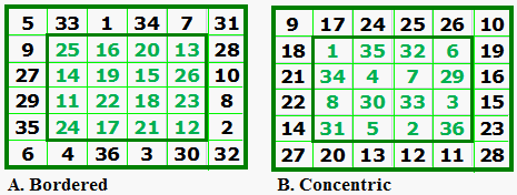 ‘a’ and ‘b’ are two consecutive numbers whose sum equals the order of the square. 'a' always appears in the bottom row, 2nd cell from the right. 'b' always appears in the top right hand corner.