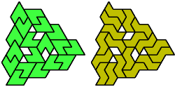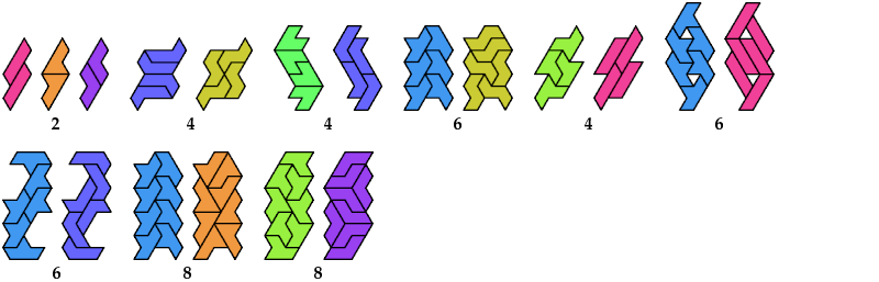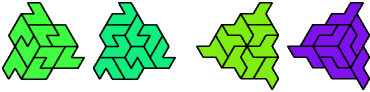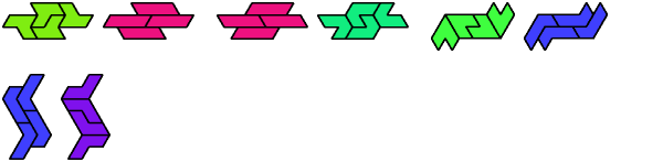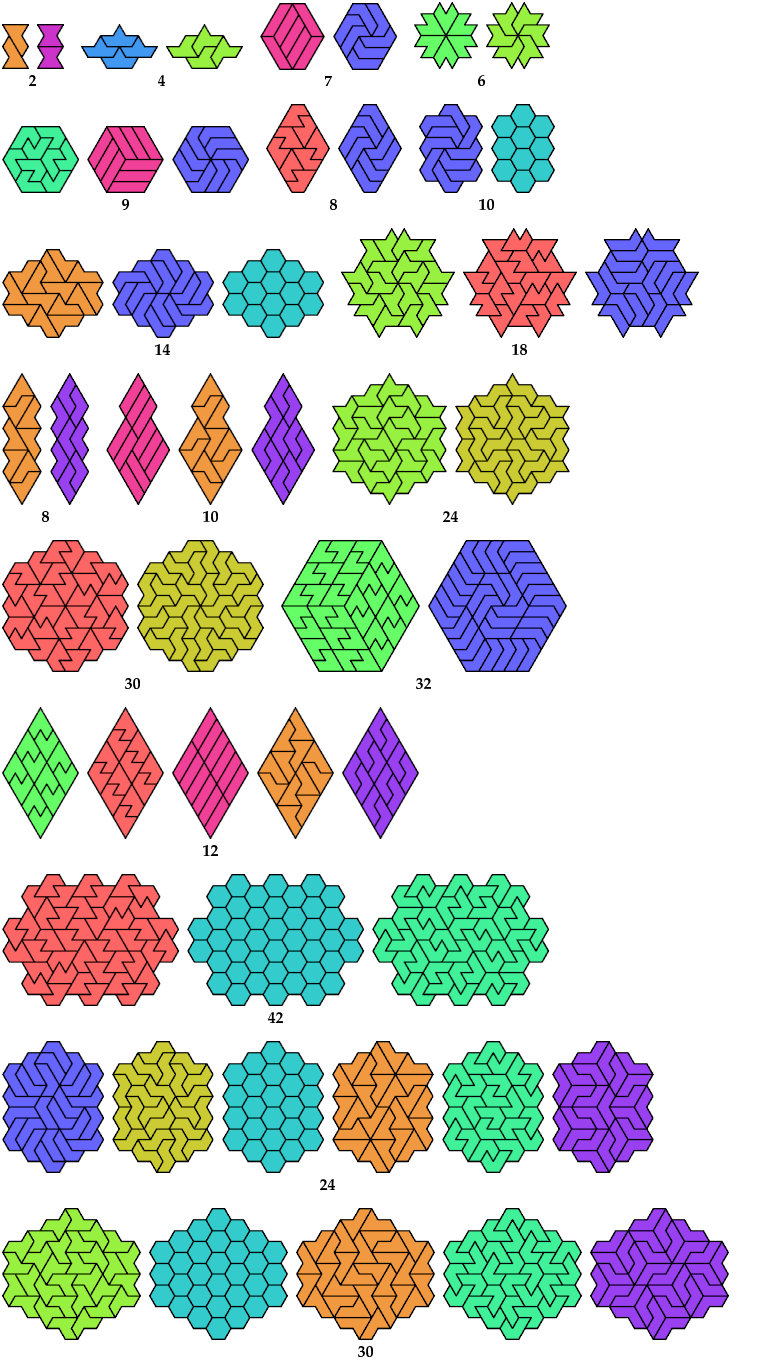 This web page and my other page, Mixed Polyiamond Compatibility, extend and correct the solutions in the JRM article. For sets of three hexiamonds, see Triple Hexiamonds.