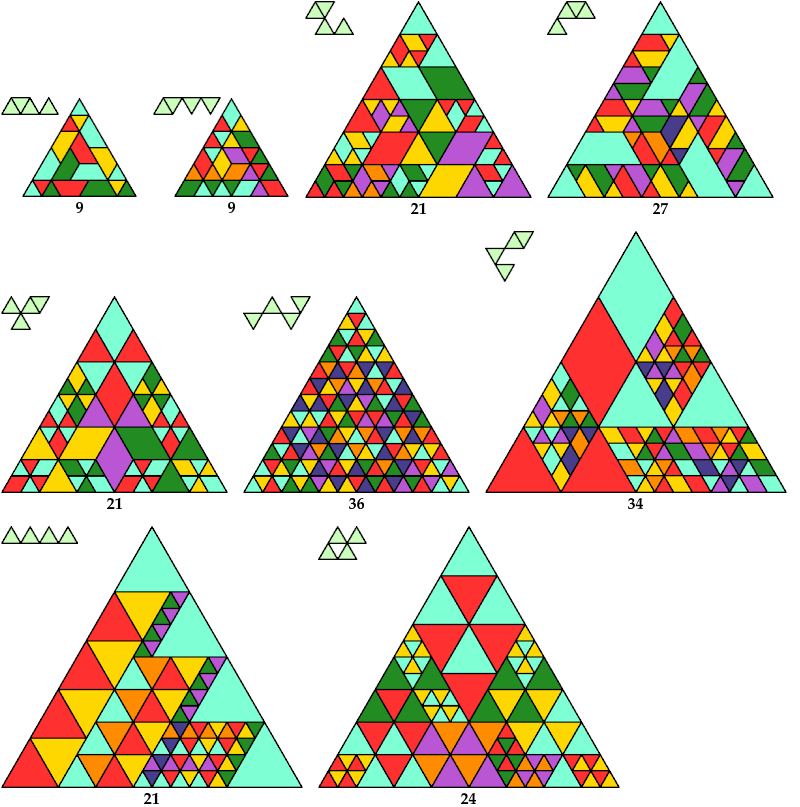 Here I show known tilings of a triangle by scaled polymings that use the fewest tiles. If you find a solution with fewer tiles, or solve an unsolved polyming, please write.