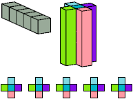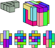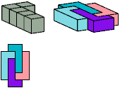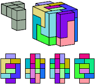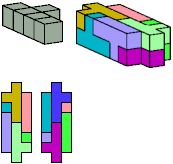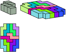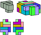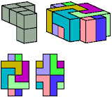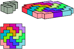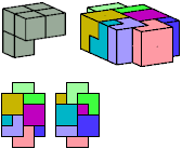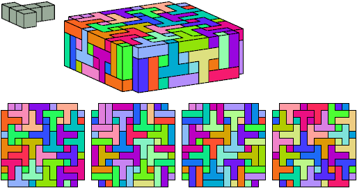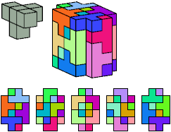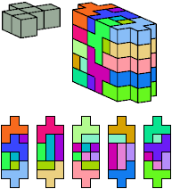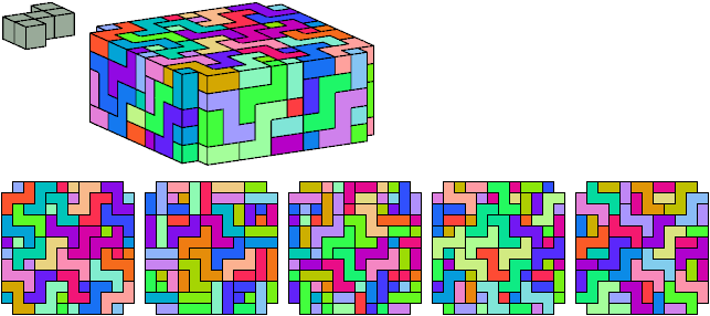 All but two pentacubes can tile a rectangular prism, or box; see Pentacubes in a Box. Here I show that every pentacube can tile a box from which the cells along four parallel edges have been removed. Dimensions are given with the height last. The cross-sections are shown from top to bottom. If you find a smaller solution for a pentacube, please write.