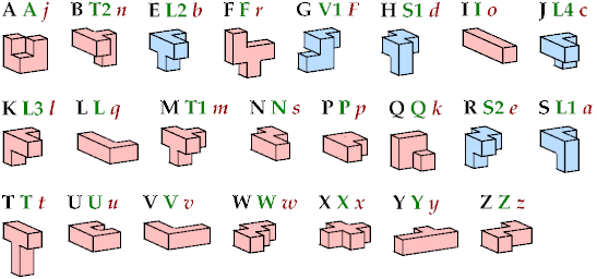 In Kate Jones's nomenclature and mine, flat pentacubes bear Solomon Golomb's names for the corresponding pentominoes. In Donald Knuth's nomenclature, flat pentacubes bear John Conway's names for the corresponding pentominoes.