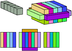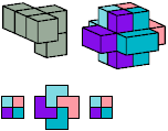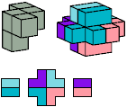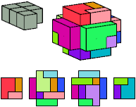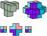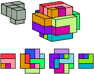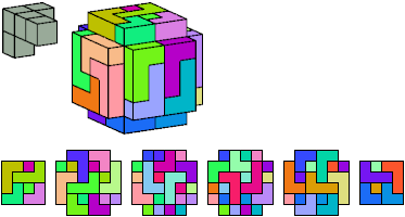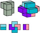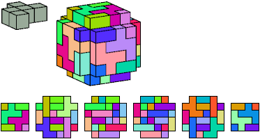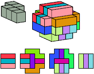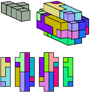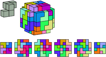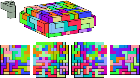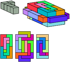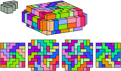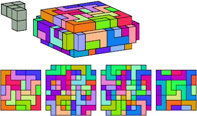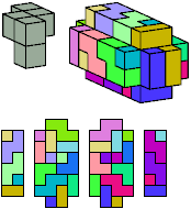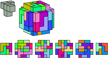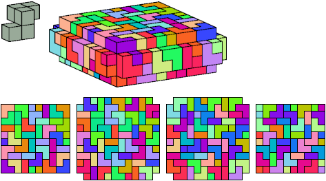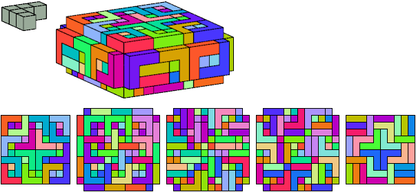 All but two pentacubes can tile a rectangular prism, or box; see Pentacubes in a Box. Here I show, for each pentacube, a minimal known box from which the cells along all edges have been removed, tiled by that pentacube. The cross-sections are shown from top to bottom. If you find a smaller solution for a pentacube, or solve an unsolved case, please write.