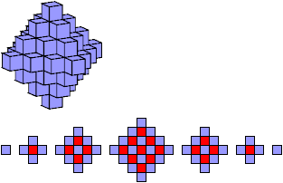 This coloring has 44 blue cells and 19 red cells. But 21 tricubes must contain at least 21 red cells. Therefore 21 right tricubes cannot tile a solid diamond of order 4.