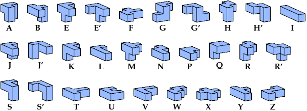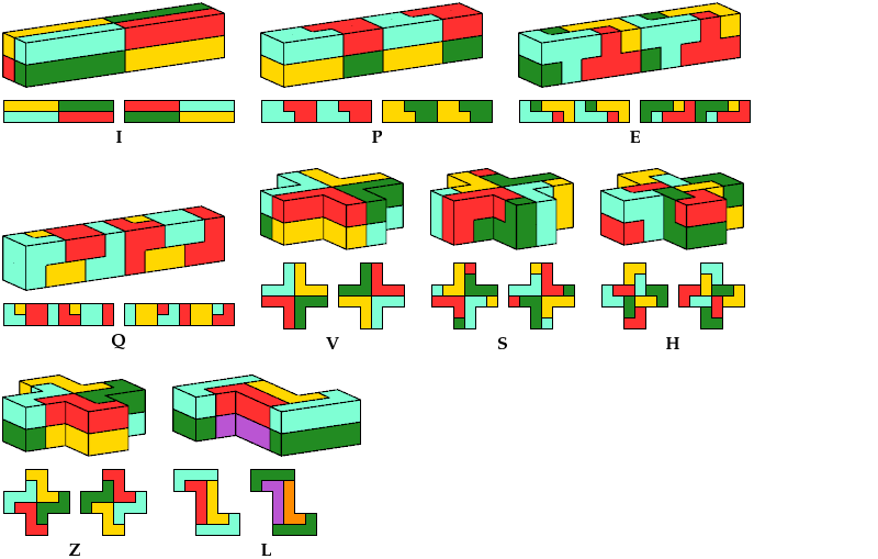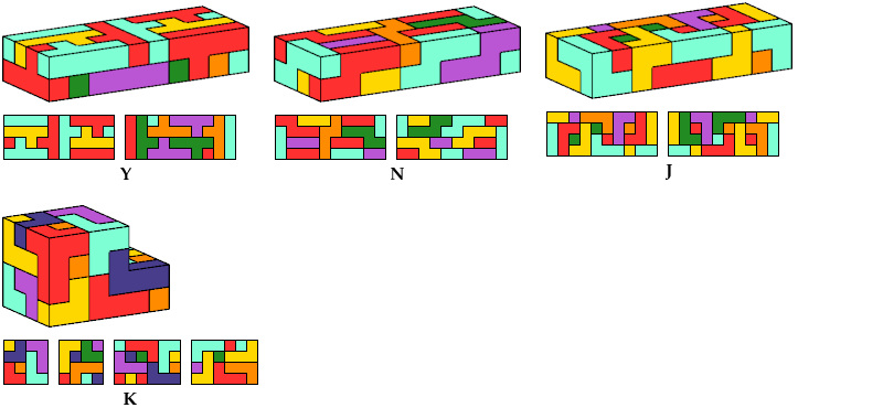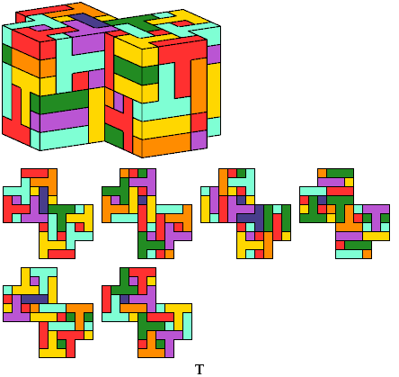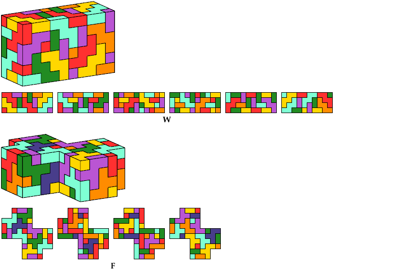 The solution shown for pentacube W is a rectangular box tiling. Smaller solutions may exist.