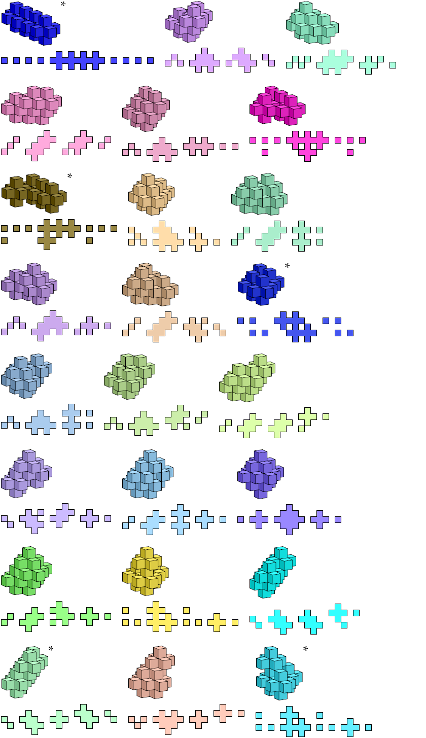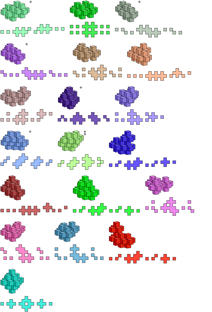 Here I show all unitary polycubes with at most 25 cells. I do not distinguish mirror images. Cross-sections are shown from the bottom up. Unitary polycubes that are known to be able to fill space are marked with an asterisk (*). That which is known to fill space only if it may be reflected is marked with a double dagger (‡).