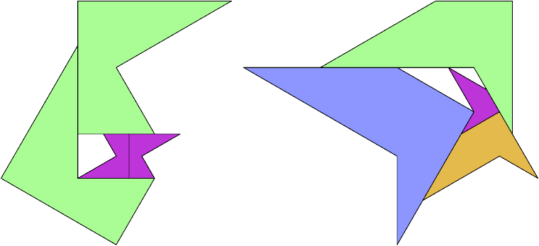 A polydrafter is a polyform whose cells are right triangles with angles 30°, 60°, 90°. It is half an equilateral triangle. Polydrafters whose cells do not conform to the underlying grid of equilateral triangles are called extended polydrafters. For example, there are six proper didrafters and seven more extended didrafters. See Bernd Karl Rennhak's site Logelium for examples.