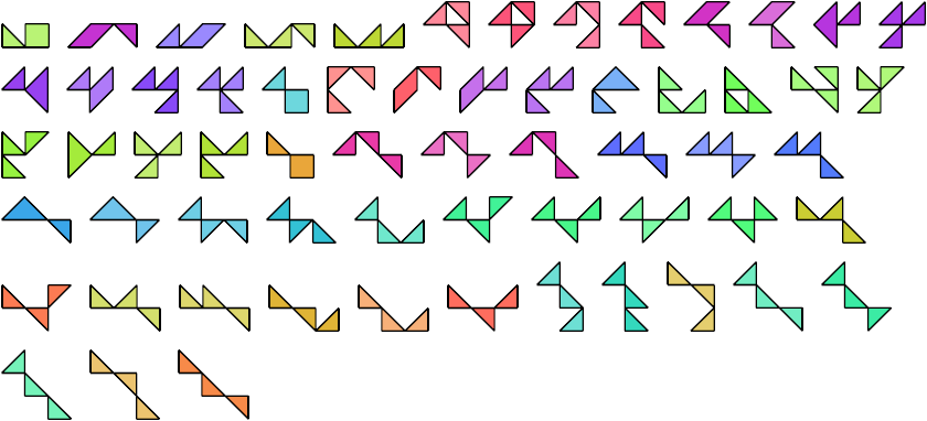 Here I present minimal known irreptilings for proper polyfetts—those that are not also polyaboloes. Polyfetts with the same shapes as smaller polyfetts are omitted. Proper reptilings are shown in shades of blue.