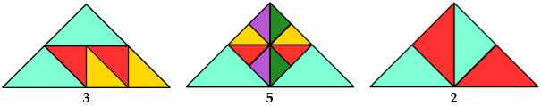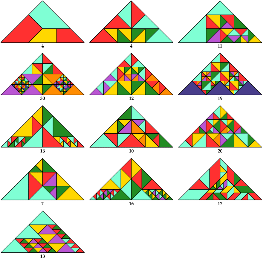 The tilings shown use as few tiles as I know how, and are not necessarily unique under this condition. If you find a tiling with fewer tiles, please write.