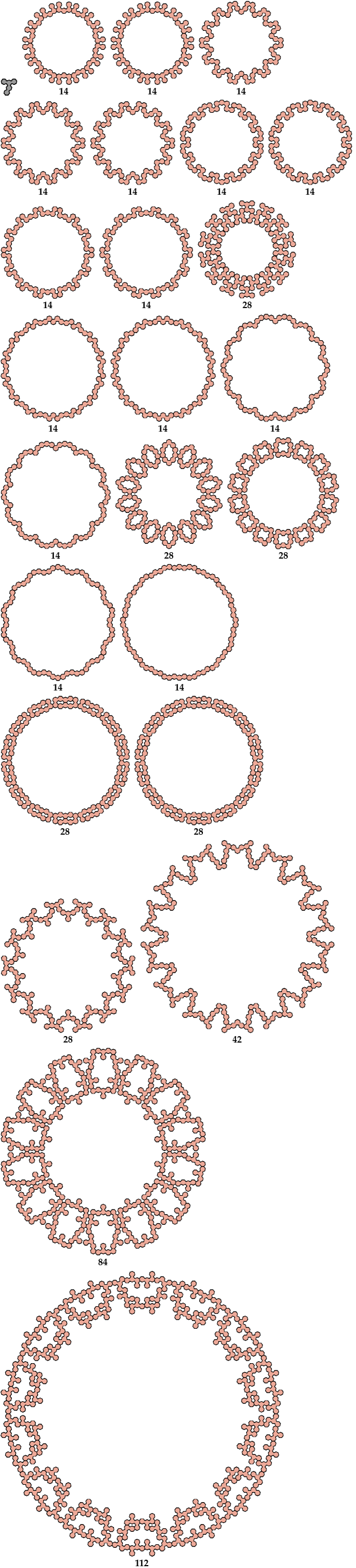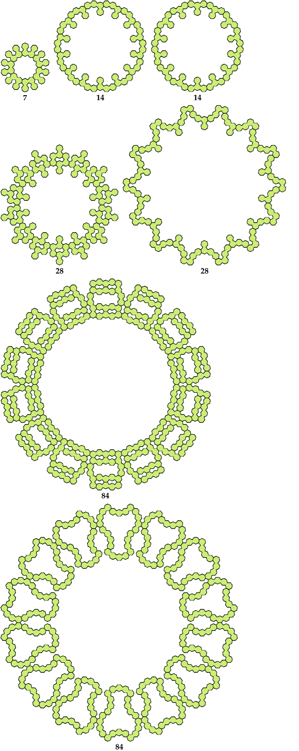 Here are minimal known Baiocchi figures for polyhepts of orders 1 through 5. Not all these solutions are uniquely minimal.