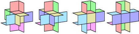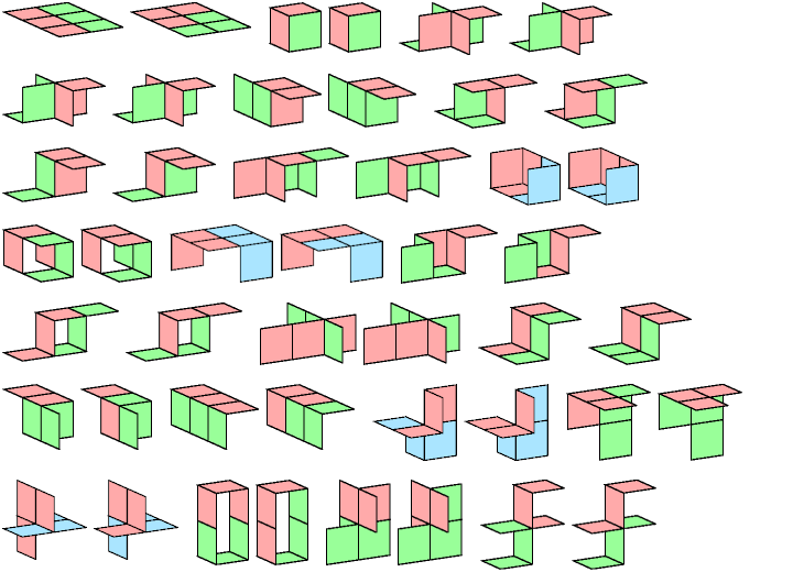 three unit squares edge to edge at straight or right angles in three dimensions.