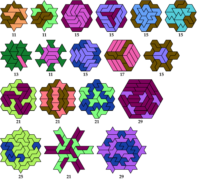 In Tetromino-Pentomino Oddities I used figures with an odd number of cells. Unlike polyominoes, a polyiamond with full symmetry cannot have an odd number of cells. Here I use figures with an odd number of tiles instead.