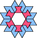 Here I show the smallest polyiamond with full symmetry that can be tiled by a hexiamond and a heptiamond, using at least one copy of each. The solutions shown are not necessarily uniquely minimal.