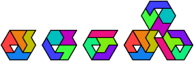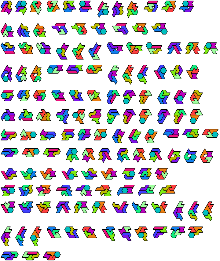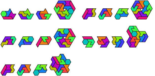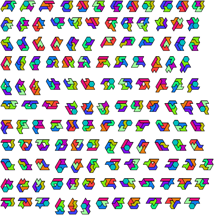 This page shows all 131 ways to arrange the 12 hexiamonds to form three congruent polyiamonds. The problem was suggested by Andris Cibulis.