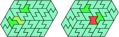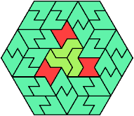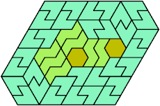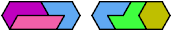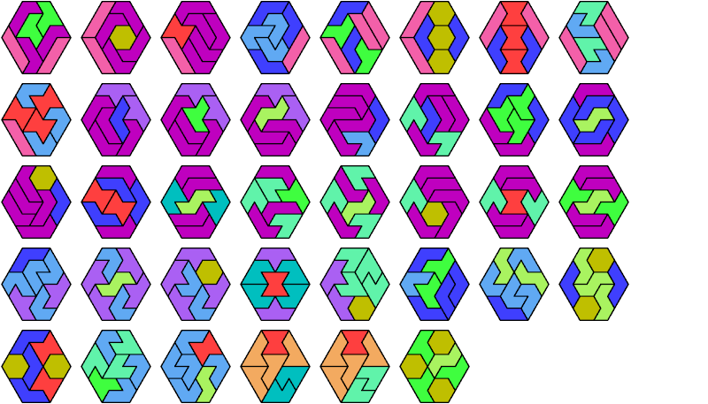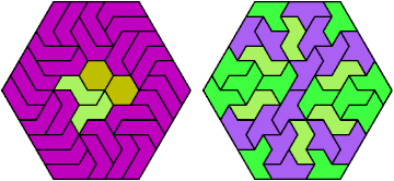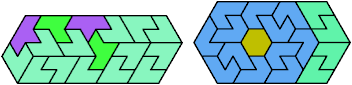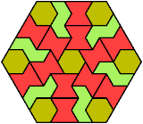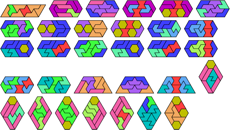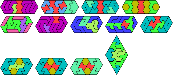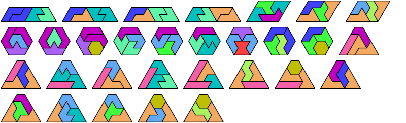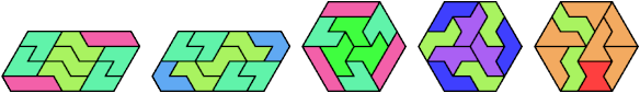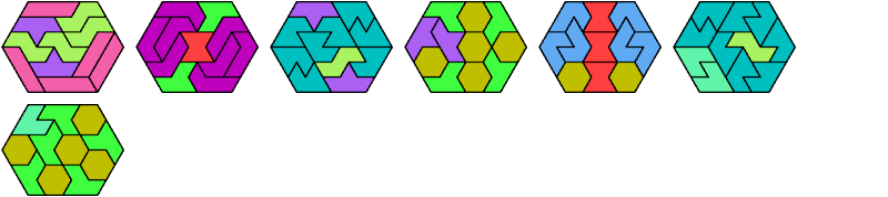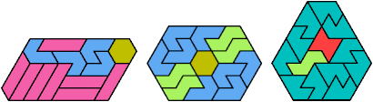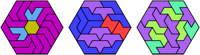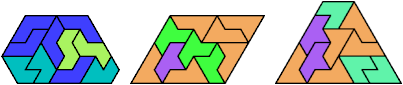 Here I show the smallest known convex shapes that can be formed with each set of three hexiamonds, using at least one of each.