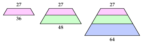 Stack the tiles thus till the longer base of the trapezium is at least twice as long as the shorter base. In the stack on the right, the longer base has length 64 and the shorter base has length 27. This satisfies the condition.