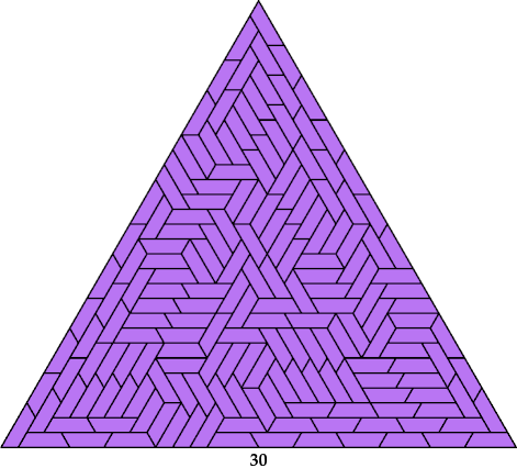 The resulting triangle has side 567. It has 45,927 tiles! That is too many to display here. But a smaller tiling may exist.