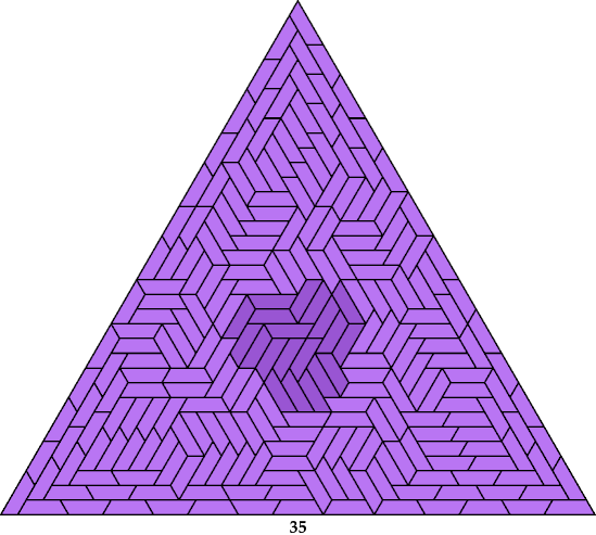 Go here for a tiling of a triangle with side 35. It has ternary symmetry except in the center. I found it in 2024.