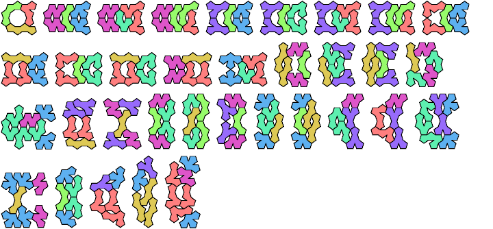Oddities can also be constructed from sets of different shapes. Here are the minimal known oddities for triplets of tetrapents, using at least one copy of each tetrapent. Please write if you find a smaller solution or solve an unsolved case.