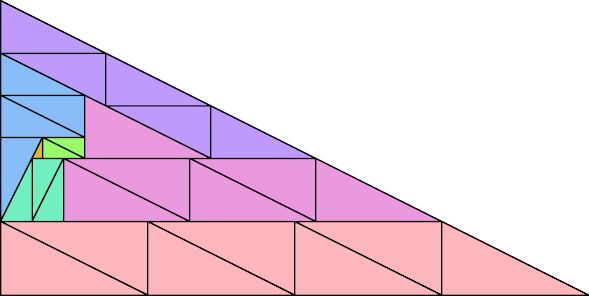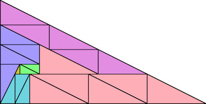 This is a contiguous partridge tiling. The tiles of each size form a connected group. This is the only contiguous partridge tiling of the monodom with 6 sizes (the minimum), except that any rectangle formed by two equal pieces may be flipped.