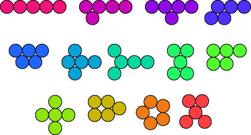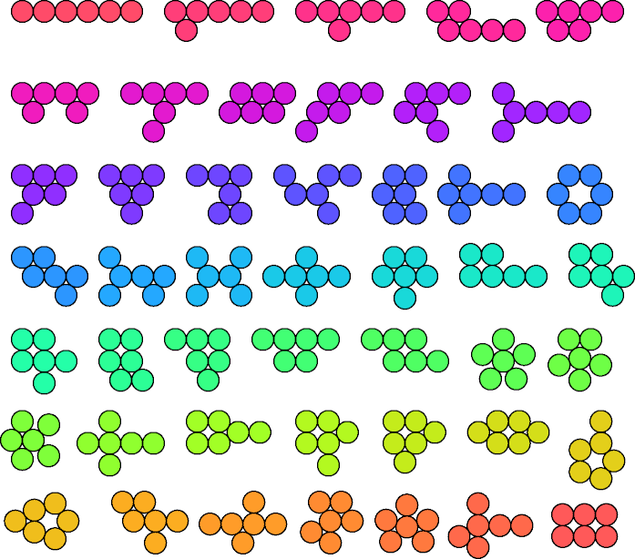 This page shows all free polypennies of orders 1–6. Erich Friedman enumerated all polypennies up to order 4. Alexandre Owen Muñiz enumerates polypennies up to order 5 on Flexible Polyforms at his site Math at First Sight.