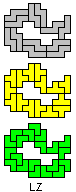 We are searching for the 120 shapes that can be covered by a pentomino or a tetromino or a tromino. We'll give precedence to the solutions on the finite plane with the smallest surface. If there aren't solutions on the plane, we'll accept solutions on cylindrical surface or on Moebius strip. Solutions on torus are not interesting because each pentomino, tetromino and tromino covers a torus. If you have better solutions, please send them to George Sicherman HERE.