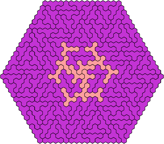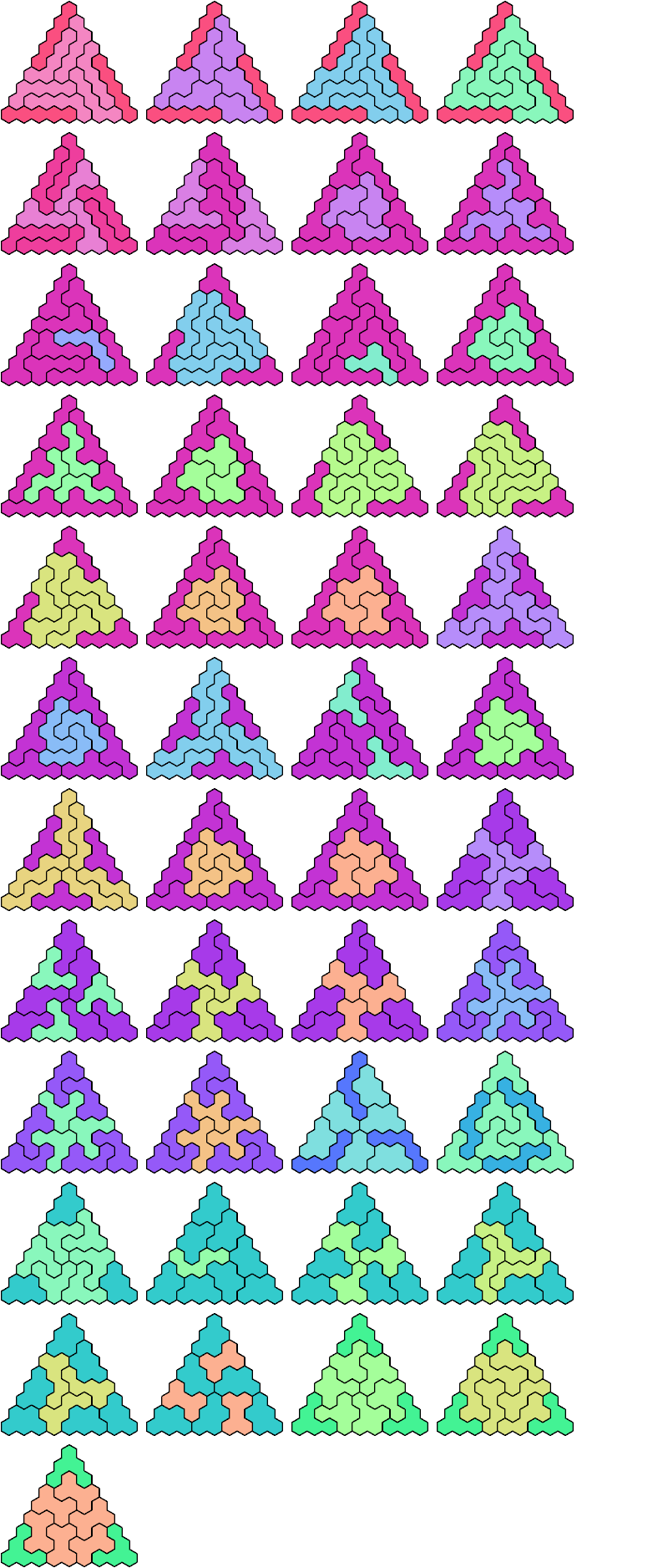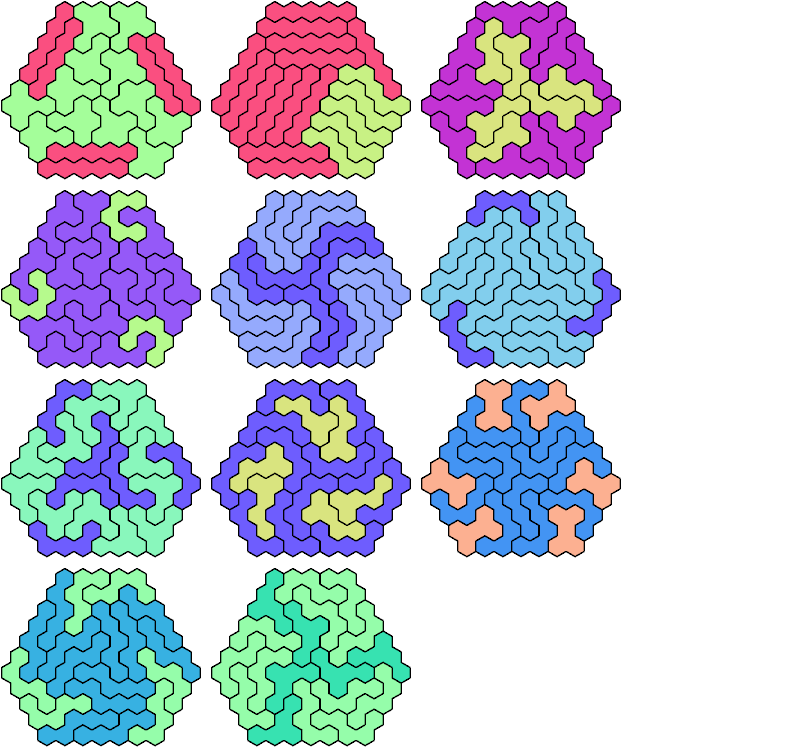 A triangular polyhex is an extreme form of a badge. Many of the solutions below are triangular. See the bottom of the page for non-triangular variants.