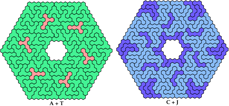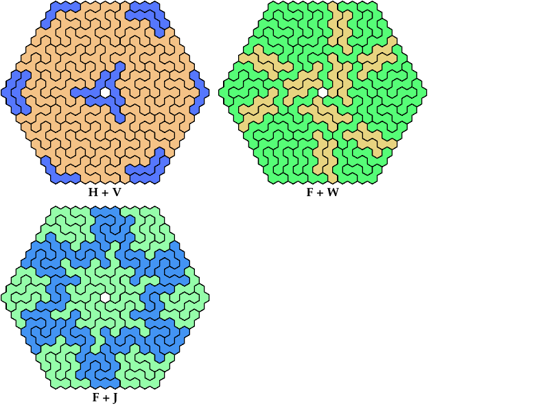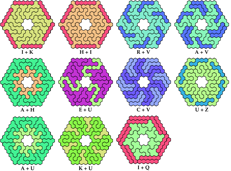 On this page, for each pair of pentahexes, I show a frame tiling with the fewest known cells, using at least one copy of each pentahex of the pair. If you find a smaller solution or solve an unsolved case, please write.