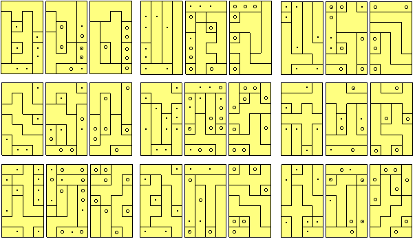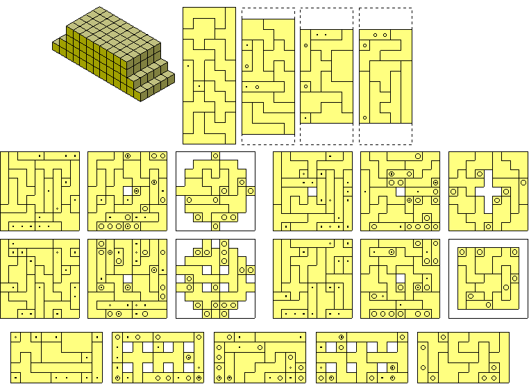 Il y a 1023 heptacubes et si vous voulez voir un dessin de l'ensemble je croyez que vous pouvez devoir le produire vous-même! Je ne sais pas de quiconque qui a tiré a permis a construit seul l'ensemble. Constructions ont été faites, cependant, avec les 108 heptacubes dérivés du heptaminos. Pour détails de ces boîtes voyez les listes de Mike Reid dans l'emplacement de Torsten Sillke ou voyez des diagrammes des solutions à Heptomino Packings. Dans ces diagrammes un point représente une continuation en haut, un cercle une continuation au dessous et un point dans un cercle montrent la continuation dans les deux directions. On peut voir un meilleur diagramme des solutions ici.