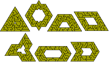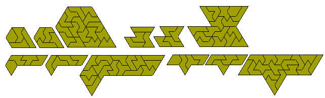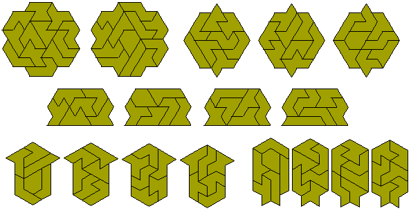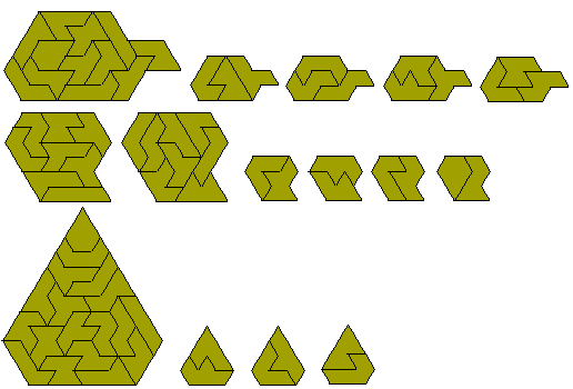 The next diagram shows a number of symmetric figures formed with the set as well as a number of solutions to the simultaneous double triplication and pentuplication of one of the pieces. It is likely that all the heptiamonds can be used as the pattern for this construction. The figure at the bottom right shows a solution to the problem of simultaneous triplication and sextuplication with a similar hole in each figure and the final construction is of simultaneous three triplications and a quadruplication of a piece..