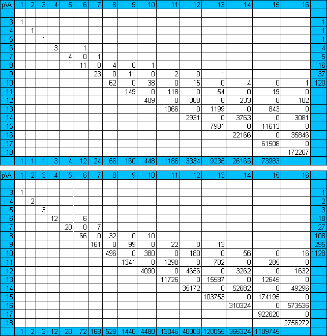 The following tables show (a) the numbers of polyominoes of a given area, A, and perimeter, P, and (b) the total areas of these sets of pieces. These tables were supplied by Brendan Owen.