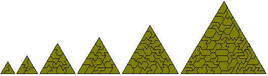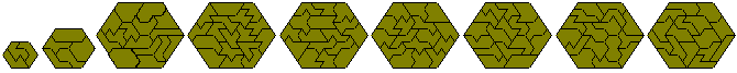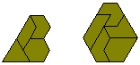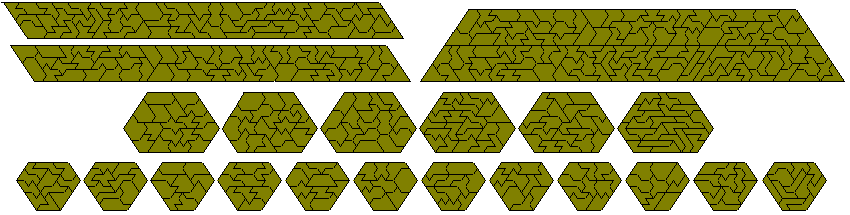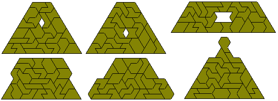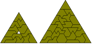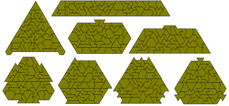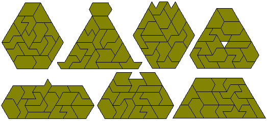 With perimeter 8 there are 16 pieces covering a total area of 108 unit triangles. Unlike the isoperimetric polyominoes the areas of isoperimetric polyiamonds are even when the peimeter is even and odd when the perimeter is odd. This gives us parity problems with the even perimeter pieces and any construction made with this set must have a colouring excess of 2 or 6. Four examples are shown below. The figure at the top right is by Livio Zucca and the one at the bottom right is by Patrick Hamlyn.