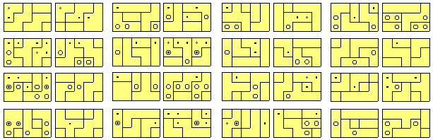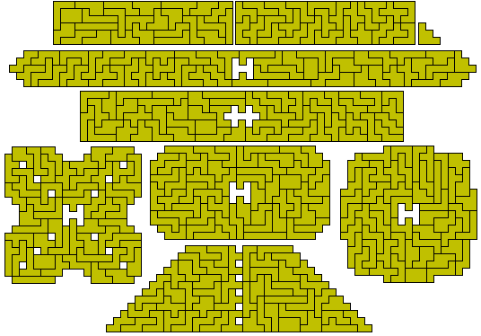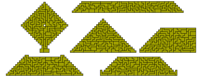 Similarly with the ditrominoes there are two pieces which can be formed in two different ways. The resulting set of 31 pieces has an unbalanced colouring so no rectangle is possible. The set can, however, form a number of symmetrical shapes.