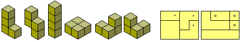 If we join dicubes we form subsets of the 2n-cubes. There are six didicubes with a total volume of 24 unit cubes (see the figure below which also shows how they can for a 2x3x4 box). Joining three dicubes gives us the 103 tridicubes made up of solid versions of the 23 tridominoes and a further 80 three dimensional pieces giving a total volume of 618 unit cubes. If we use one of each mirror pair then we get a set of 67 pieces. Since both 103 and 67 are primes the only possible boxes would be 2x3x103 or 2x3x67.